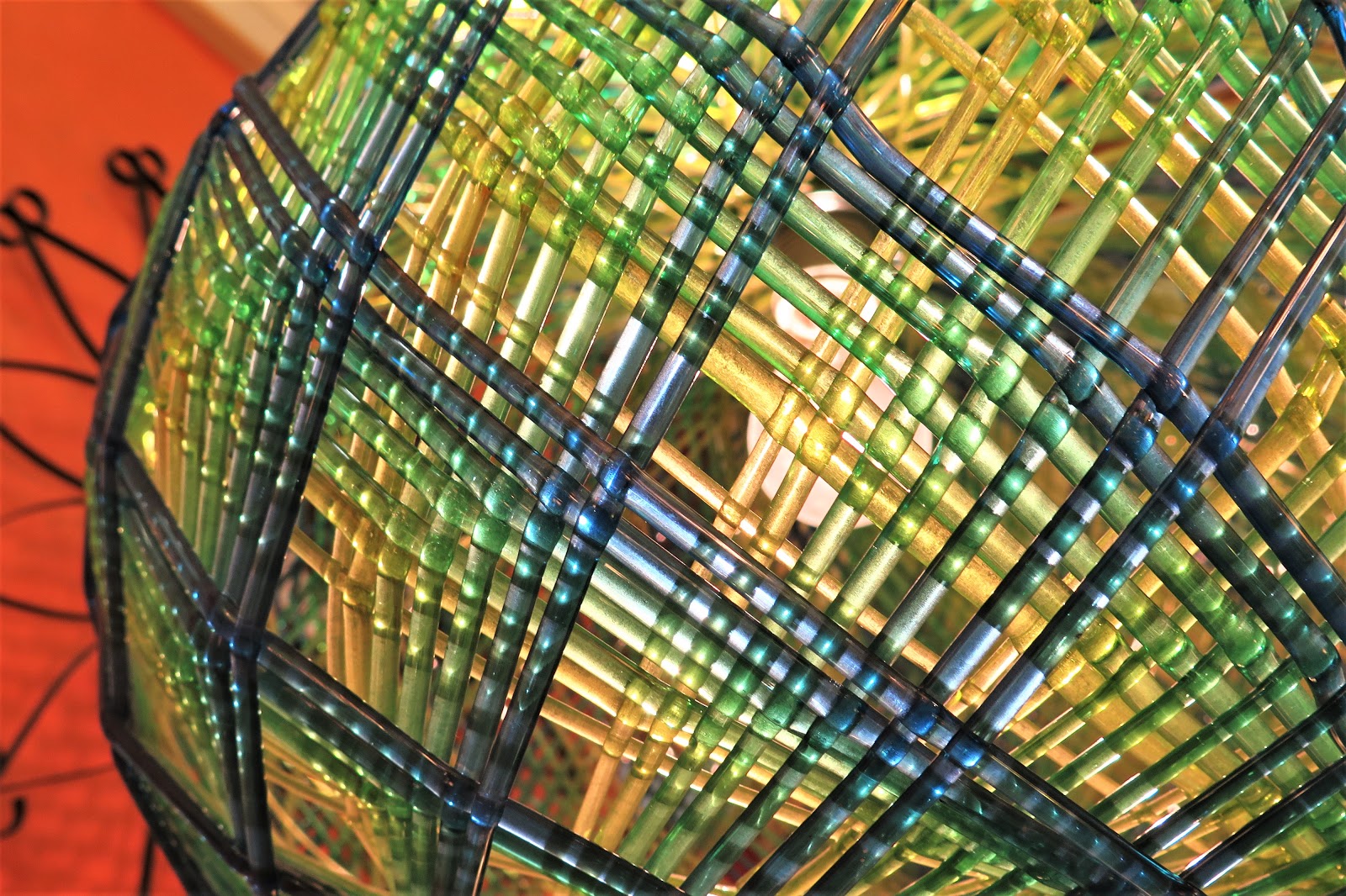 ラタン調に編み込まれたカラフルなアクリルランプ。
