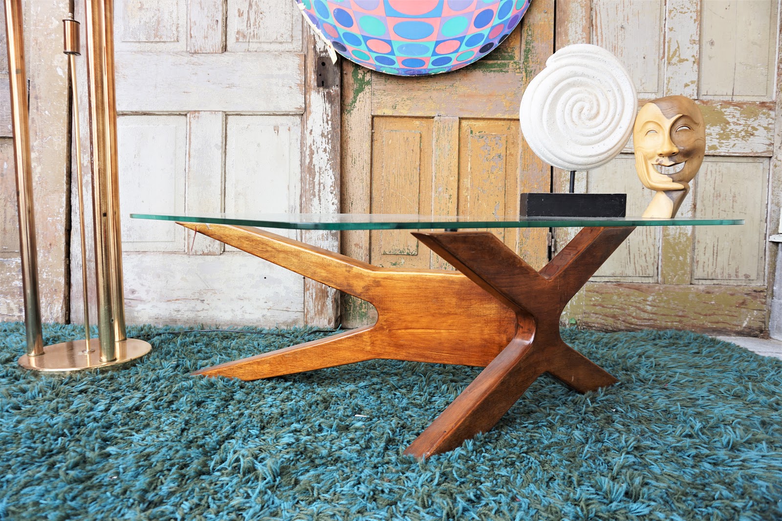 一緒に合わせていたガラストップコーヒーテーブルもウッドの彫刻作品の様な